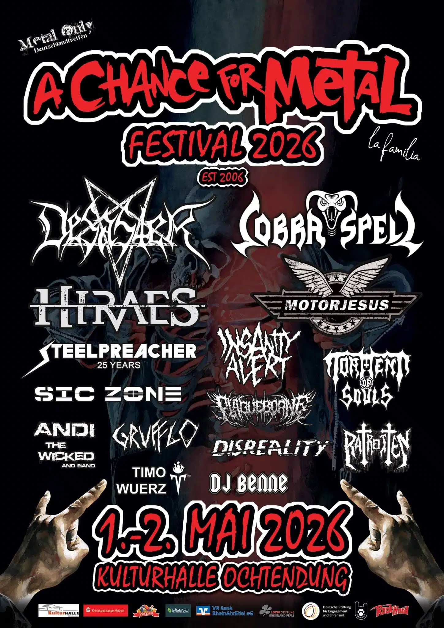 KULTURHALLE OCHTENDUNG, Langenbergstraße, 56299 Ochtendung Langenbergstraße, Ochtendung, Rheinland-Pfalz, DeutschlandJetzt ist es final! Mit Hiraes , Grufflo und Plagueborne ist das Line-up fürs A Chance for Metal Festival 2026 komplett! Wir feiern 20 Jahre ACFMF – am 1. & 2. Mai 2026 in der Kulturhalle Ochtendung. Dieses Jubiläums-Line-up hat alles: hart, laut und bunt gemischt, die extrem gewünschte Rock & Metal Karaoke mit DJ […]